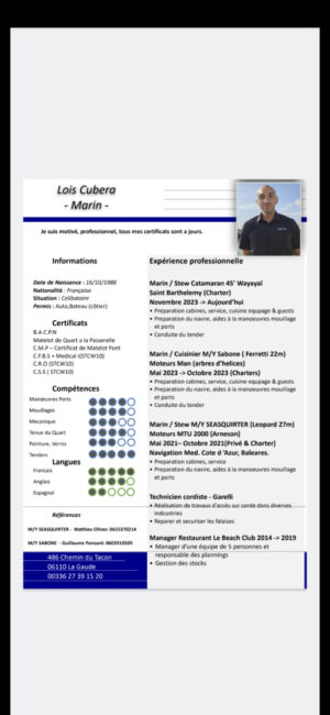 Je suis à la recherche d’un poste de matelot de pont. Motivé, fiable et prêt à m’investir pleinement, je suis déterminé à apporter mes compétences, mon sens du service et mon esprit d’équipe pour contribuer au bon fonctionnement du navire et à la réussite des missions à bord. -