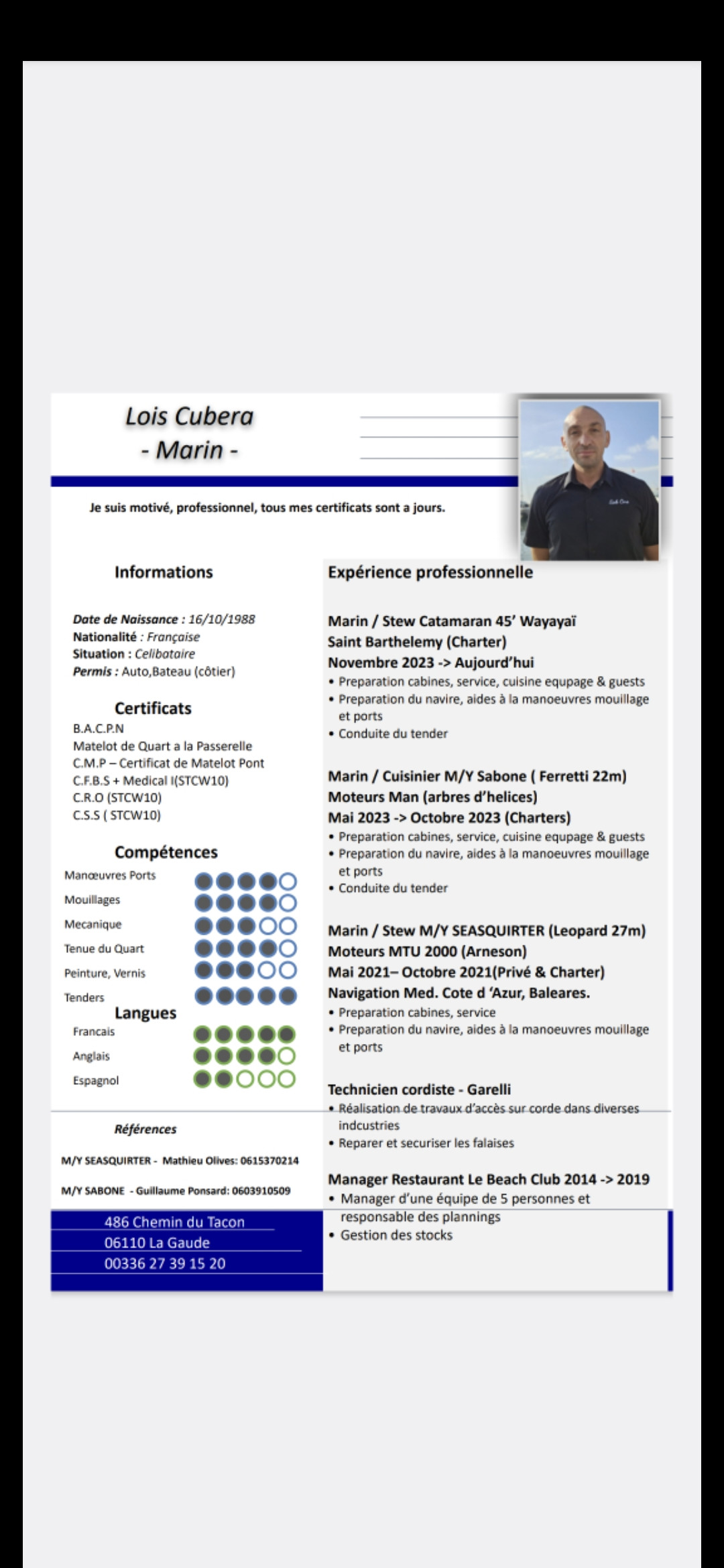 Je me permets de vous contacter concernant votre annonce pour le poste de marin sur le M/Y de 23 mètres.