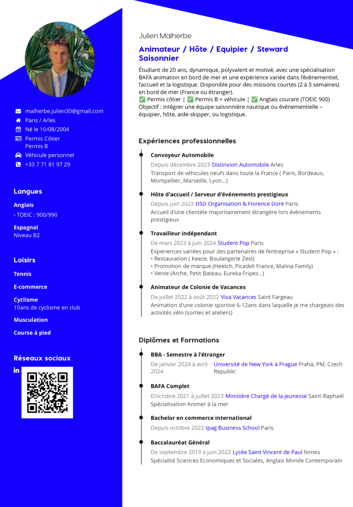 Hello ! Je suis Julien, 20 ans, étudiant en commerce international, ultra motivé pour bosser cet été en bord de mer ou à bord de bateaux, en France ou à l’étranger 🌍🎯 Ce que je cherche :